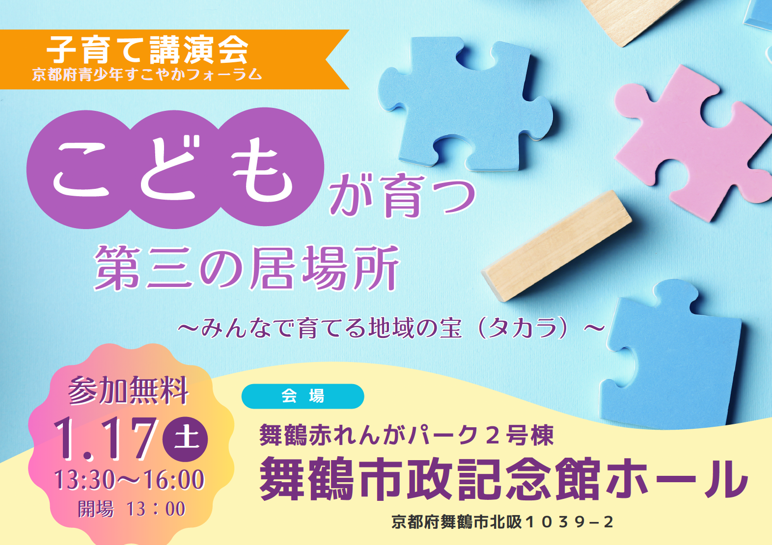 京都府青少年すこやかフォーラム 日付2026/01/17 会場舞鶴市政記念館ホール 住所京都府舞鶴市北吸1039−2 主催京都府青少年育成協会・舞鶴市子ども育成支援協会 京都府青少年育成協会・舞鶴市子ども育成支援協会さまからのご依頼で、「子どもが育つ第3の居場所 ~みんなで育てる地域の宝~」をテーマに子育て講演会の講師兼ファシリテーターとして登壇予定です